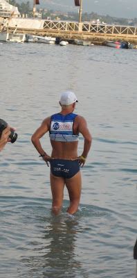 She escorted me to my bike and I took a quick chug from the bottle and felt much better. But now the line to get into the water was really long. I think she saw my distress so she grabbed me and off we went. She took me through the transition area and then around by the hoses and opened a gate that let me jump right into the water. That was pretty sweet because it seemed that it was taking everyone FOREVER to get in.